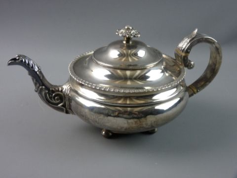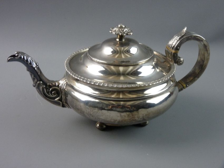 A SILVER TEAPOT of circular bullet form and of stepped design with a narrow pedestal having four ball feet, a wide line handle, a spout with scrolled decoration and a shaped knop, 21.5 troy ozs, Edinburgh 1818, makers William and Patrick Cunningham