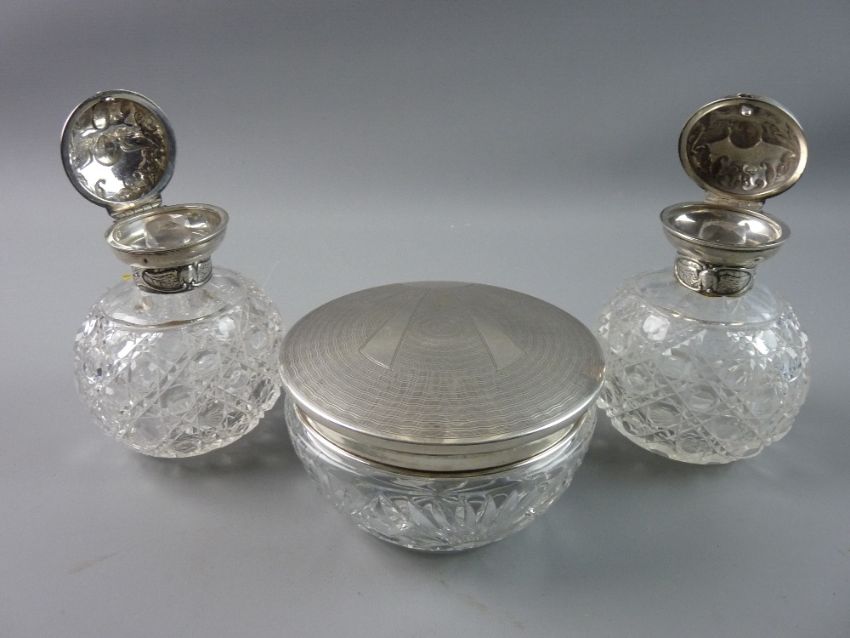 THREE HALLMARKED SILVER AND GLASS DRESSING TABLE ITEMS to include two hobnail cut scent bottles with hinged silver lids and interior stoppers, London 1899 and a silver topped glass powder bowl with engine turned and Art Deco sunburst pattern, Birmingham 1938 with interior mirror (embossed areas worn with impact damage to silver and glass of one bottle, embossing worn, several small dents, part of button-push to lid missing to the other)