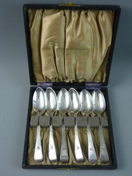A SET OF SIX GEORGIAN SILVER TEASPOONS with bright cut decoration and 'E W' monogram, hallmarked London 1789, 2.7 troy ozs, in a later case