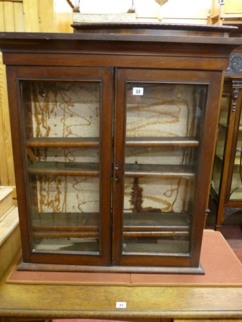 A NEAT VICTORIAN MAHOGANY WALL CABINET with twin glazed doors and adjustable interior shelves, 81.5 x 74 cms