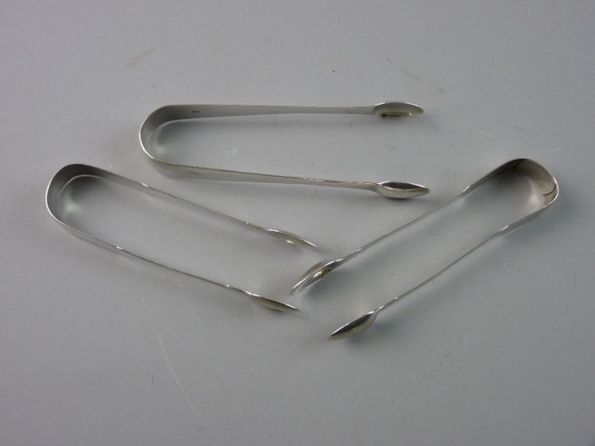 TWO SILVER FIDDLE PATTERN PLAIN SUGAR NIPS AND ANOTHER, all 19th Century, 3.3 troy ozs, two hallmarked London and one Dublin