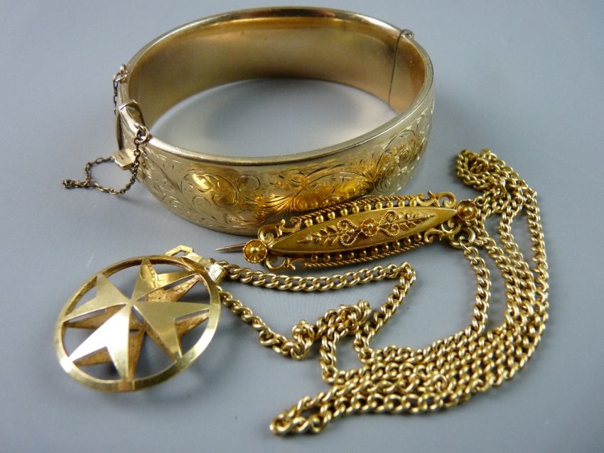 A FIFTEEN CARAT GOLD VICTORIAN BROOCH, 3.5 grms, an eighteen carat gold Maltese Cross pendant on chain and a chased decorated bangle, one fifth nine carat gold with metal core