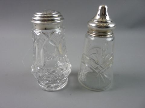 TWO HALLMARKED SILVER TOPPED CUT GLASS SUGAR SIFTERS, hallmarks for London 1928 and Sheffield 1936, 15 and 13.5 cms respective heights