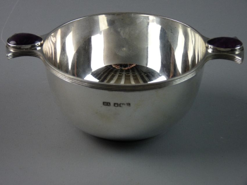 A HALLMARKED SILVER QUAICH, the handle set with cabochon oval moss agates, Sheffield 1921 with 'H A' maker mark, probably Atkin Brothers - Harry Atkin, 4 troy ozs gross (small dent to one side, small nick to rim)