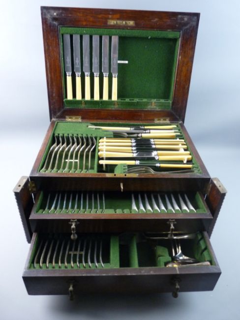 AN OAK CASED PART CANTEEN OF ELECTROPLATE TABLE CUTLERY eighty-four pieces total plus three napkin rings, one silver, 26.5 x 49cm, 37 depth case
