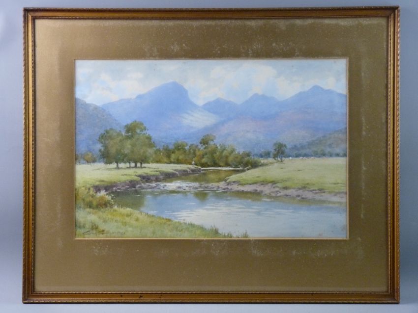 WARREN WILLIAMS ARCA watercolour - probably the River Glaslyn with fishermen on the bank and cattle grazing, in original mount and frame, 32.5 x 50 cms