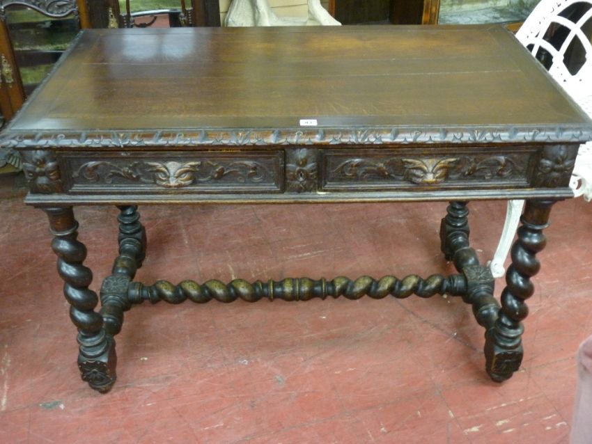 A VICTORIAN CARVED OAK SIDE TABLE, the crossbanded top with carved moulded edge, twin mask handled frieze drawers, barley twist and block supports with central cross-stretcher, 76 cms high, 116 cms wide