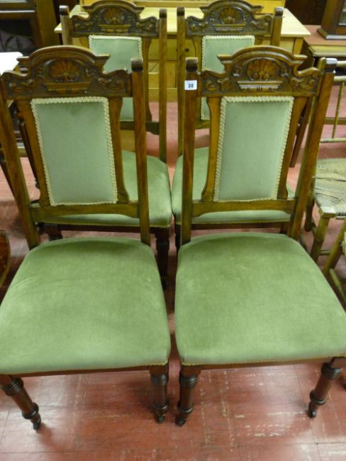 A GOOD SET OF FOUR SALON SIDE CHAIRS circa 1900 walnut with carved top rail, padded back centres and stuff-over upholstered seats on turned and block front supports with brass castors