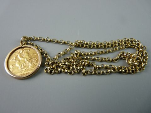 A GEORGE V HALF SOVEREIGN dated 1915 in a nine carat gold pendant mount with chain
