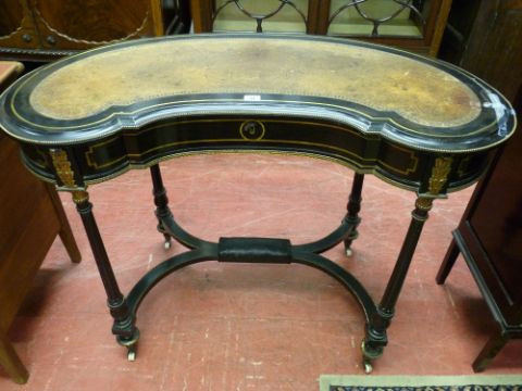 AN EBONIZED AND BRASS STRUNG KIDNEY SHAPED WRITING DESK, circa 1880 with brown tooled leather top and single frieze drawer, reeded and turned supports with 'X' frame stretcher on brass cup and white pot castors with gilt metal mounts and edging (some restoration required), 74.5 cms high, 104 cms wide
