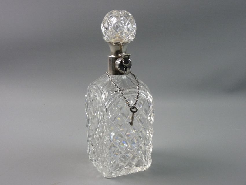A HEAVY SQUARE HOBNAIL DECORATED WHISKY DECANTER having an elaborate silver locking collar with key and the hinged glass lid having a silver collar also, Birmingham 1931