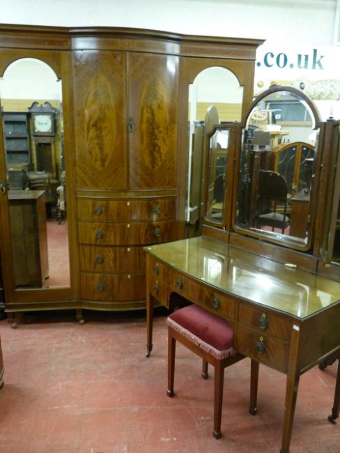 A GOOD CIRCA 1900 INLAID MAHOGANY THREE PIECE BEDROOM SUITE of double mirrored wardrobe with bow front press cupboard centre section, kneehole dressing table with triple mirror back and stool along with a 4 ft 6 ins slatted end bed with sprung base, 225 cms overall height, 95 cms wide the wardrobe