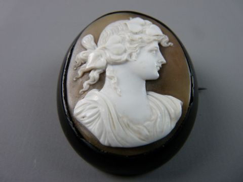 AN ANTIQUE OVAL WHITBY JET FRAMED AND BACKED CAMEO BROOCH with Victorian young lady bust having flowing ribboned hair etc, 4.5 x 3.8 cms in original W Hamond box with outer cover and with Whitby Jet original guarantee