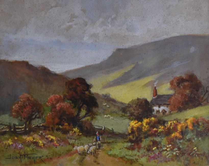 JOSH FISHER watercolour - landscape with shepherd and flock with cottage beyond, signed, 22 x 27cms