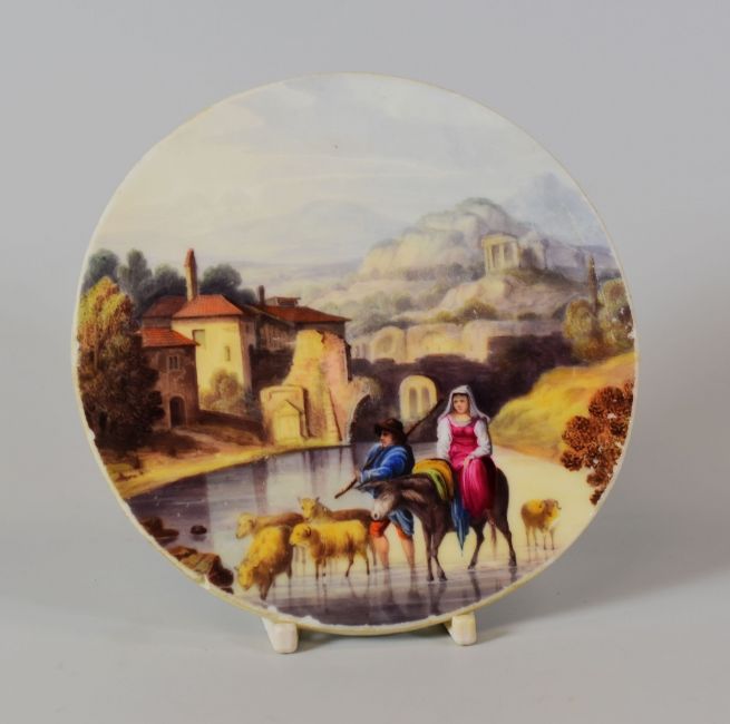 A NANTGARW PORCELAIN CIRCULAR PLAQUE painted with a Grand Tour type Italianate landscape featuring a shepherd and companion in a river with sheep and mule, villa and ancient ruins beyond, impressed NANT GARW CW to base, 13.5cms diam