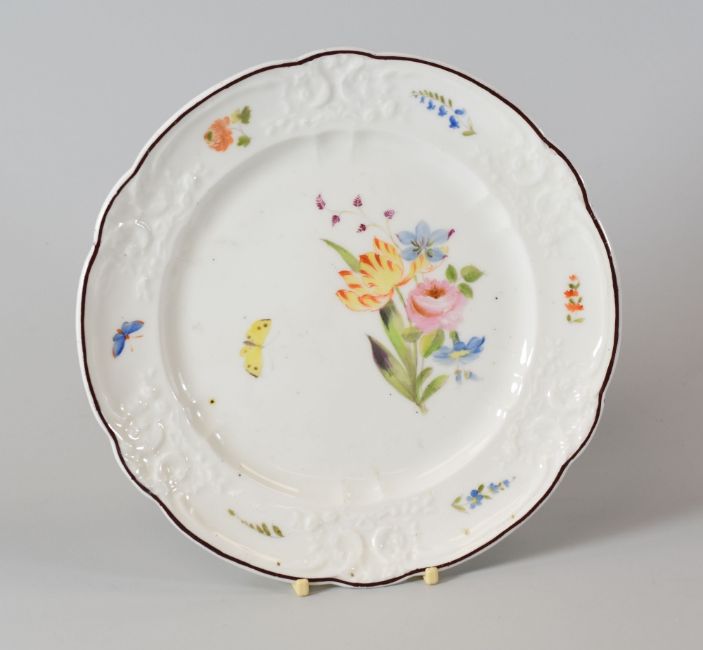 A NANTGARW PORCELAIN PLATE having a moulded and lobed border locally decorated with butterflies and wild-flowers and having a chocolate rim, 22cms diam