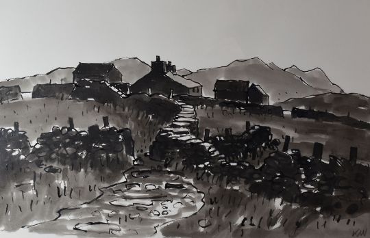 SIR KYFFIN WILLIAMS RA colourwash - Snowdonia farmstead and dry-stone walls, entitled verso 'Farm at Cesarea', signed with initials, 35 x 56cms