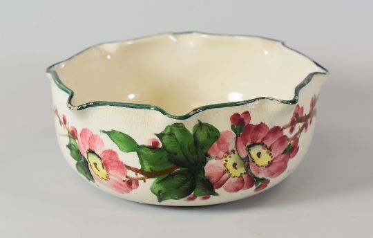 LLANELLY POTTERY BOWL painted with wild-roses and having a crimped rim, stencilled mark to base, 17cms diam