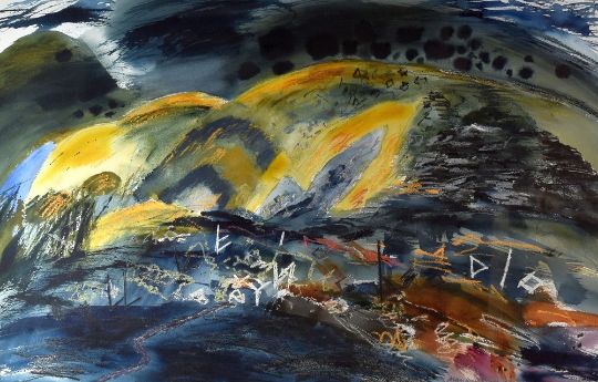 MARY LLOYD JONES watercolour - expansive and colourful Rheidol Valley landscape, West Wales, entitled 'Ystumthuen', signed and dated '95, 65 x 100cms