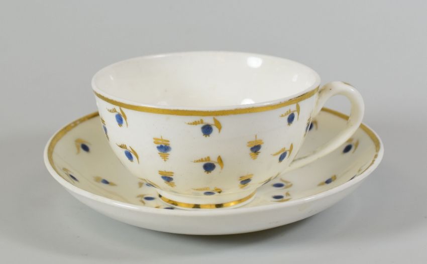A NANTGARW PORCELAIN 'HENSOL CASTLE' CUP & SAUCER with blue berries and gilded leaves and with gilded rim, saucer 14cms diam
