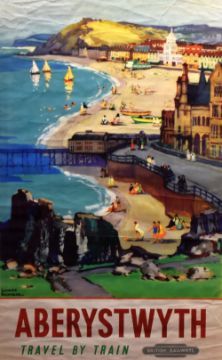 LEONARD RICHMOND British Railways platform poster - 'Aberystwyth - Travel by Train' with a vista of the town including pier and busy beach with sailing boats, 100 x 63cms