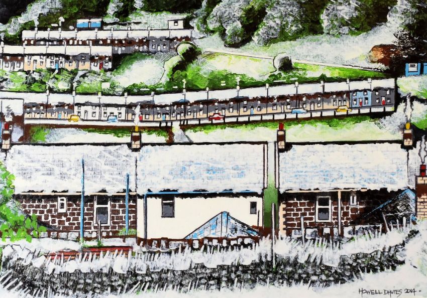 HOWELL DAVIES acrylic - South Wales valley terraces, entitled verso 'Winter, Nantymoel', signed and dated 2014, 25 x 35cms