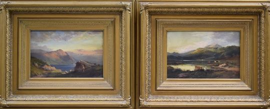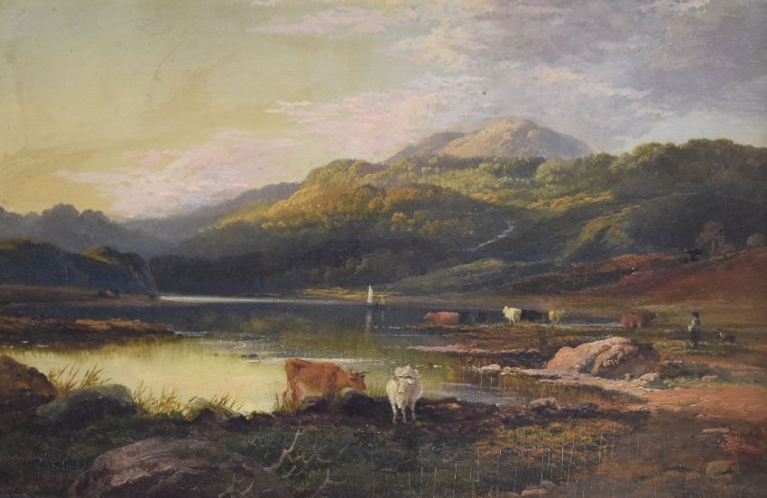 THOMAS WHITTLE oils on board a pair - North Wales landscape scenes with figures, sheep and cattle by lakes, each signed and dated 1867 with partially legible Rowney title labels verso, 19 x 29cms