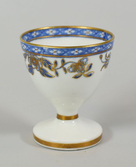 A RARE SWANSEA PORCELAIN EGG CUP decorated with a continuous band of blue and gilded flowers and motifs, 5.1cms high