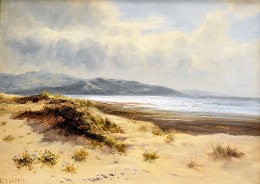 DANIEL SHERRIN oil on canvas - Conwy estuary with dunes and the Carneddau mountain range, Snowdonia beyond, signed, 32 x 44cms