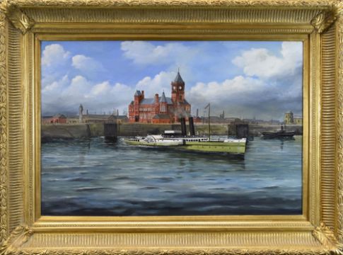T WHITFIELD oil on board - historic view of the paddle steamer 'Westonia' in Cardiff Docks with Pier Head building, prior to the Cardiff Bay development, 50 x 75cms