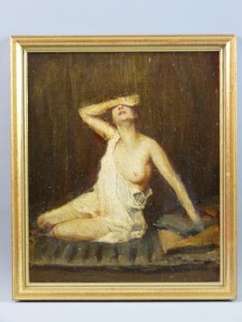 ENGLISH SCHOOL oil on board - kneeling semi-nude lady shielding her eyes, indistinctly signed, 31.5 x 26 cms