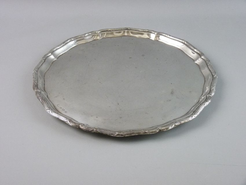A SILVER CIRCULAR TRAY, 31 cms diameter with decorative raised wavy edge border on three squat feet, Birmingham 1927, 23 troy ozs