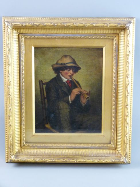 J K oil on board - young Continental hatted boy seated on a wicker chair playing a flute like instrument, initialled and dated 1862, 22.5 x 17.5 cms