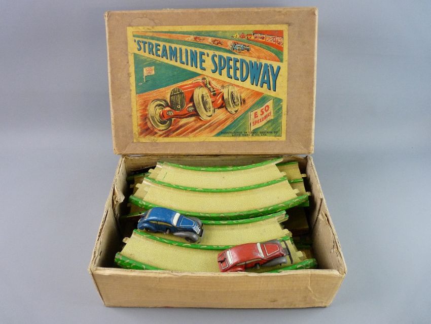 A LOUIS MARX & CO STREAMLINE SPEEDWAY SET, tinplate toy sectional track and two clockwork driven racing cars in original box