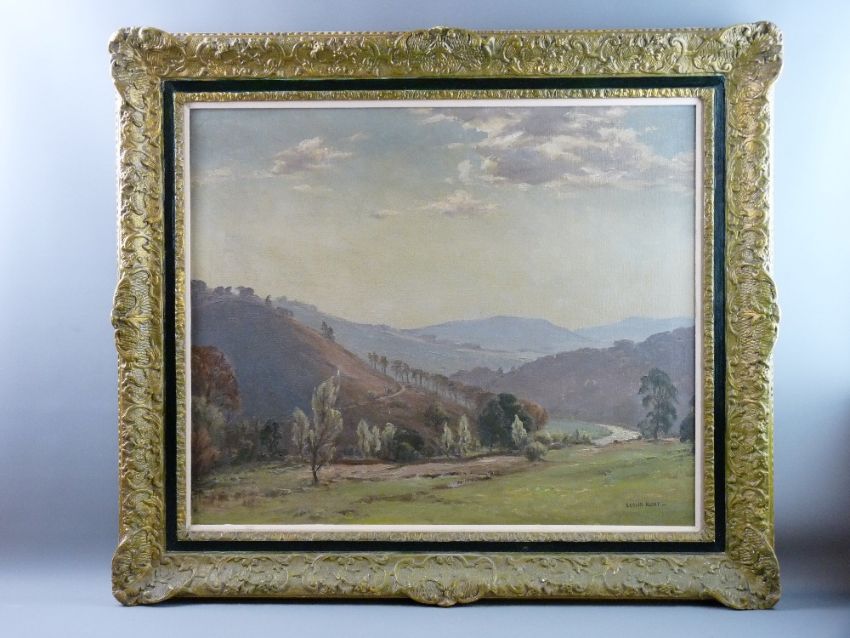 LESLIE KENT oil on canvas - peaceful English river valley landscape, signed, 60 x 73 cms