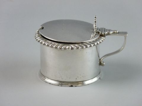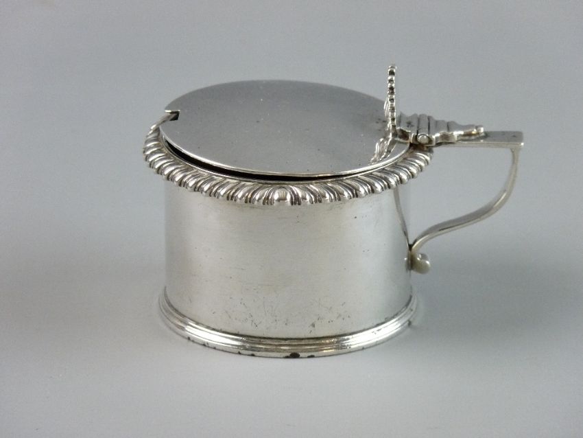 A SILVER DRUM SHAPED MUSTARD POT, lidded with shell thumbpiece, gadrooned edge and gilt interior (no liner), 7.5 cms diameter, 'Messrs Barnard' maker's mark, dated London 1834, 4.5 troy ozs