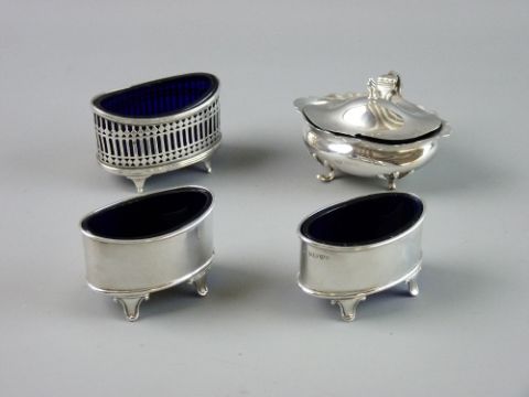 A GROUP OF SILVER SALTS to include a lidded example on four feet, a pierced oval on four feet, both Birmingham 1911 but non-matching and a pair of oval shaped salts on four feet, Chester 1905 and 1906, all with blue glass liners, 5.6 troy ozs weighable