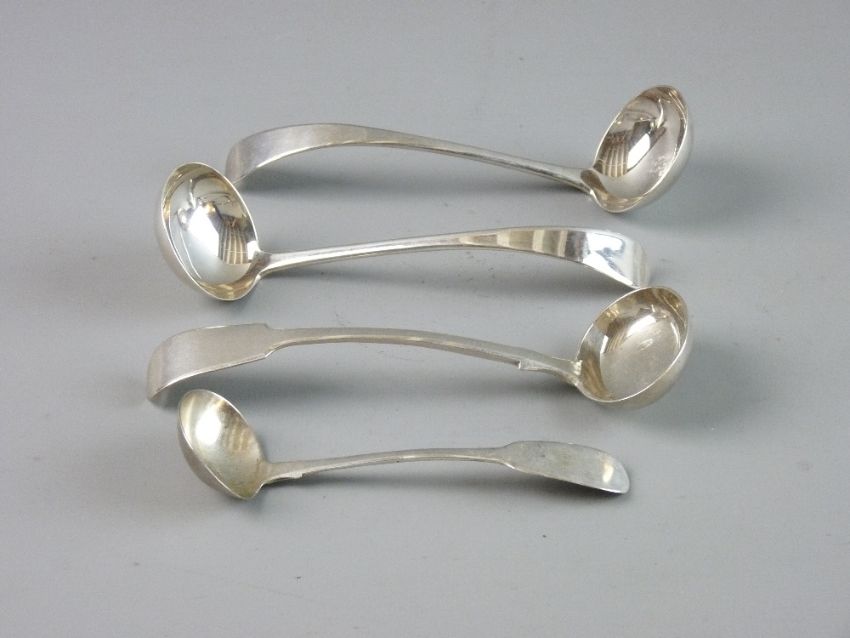 A PAIR OF SILVER PLAIN CREAM LADLES with curved handles, 1.7 troy ozs, Edinburgh 1824 and two non-matching fiddle patterned cream ladles, 1.5 troy ozs, London 1878 and 0.5 troy ozs, Exeter 1833