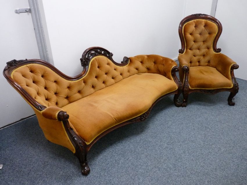 A VICTORIAN CARVED MAHOGANY CAMEL BACK COUCH & MATCHING ARMCHAIR, the open carved back with floral and leaf decoration, good knurled arm ends with raised carved knees and feet, the spoonback armchair similarly carved, both items with button back upholstery, 84 cms maximum height, 185 cms wide, 84 cms deep (couch), 103 cms high, 70 cms wide, 58 cms seat depth (chair)