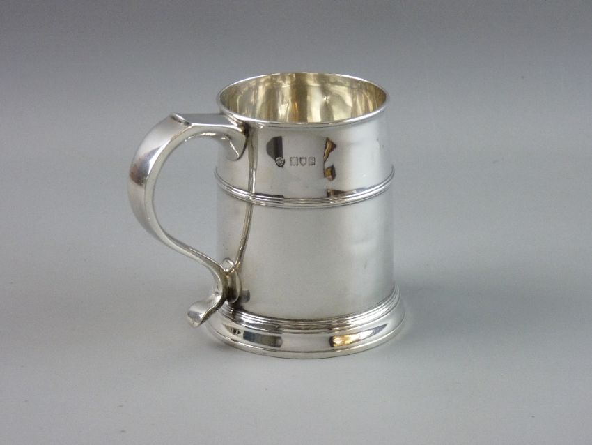 A SILVER TANKARD of tapering cylindrical form with banding, London 1913, 11.6 troy ozs