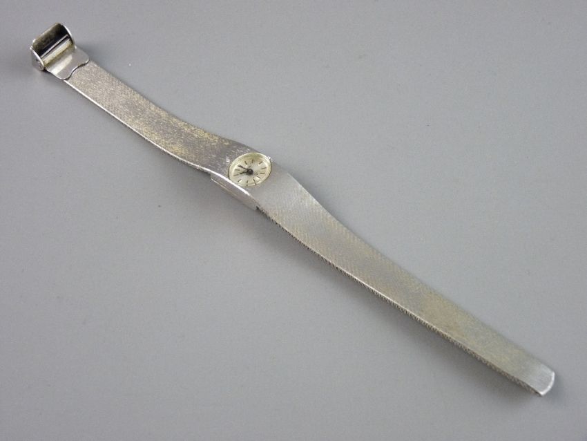 A LADY'S SILVER ENCASED (circa London 1977) OVAL DIAL EXCALIBUR WRISTWATCH with incorporated and graduated bracelet, 40 grms gross