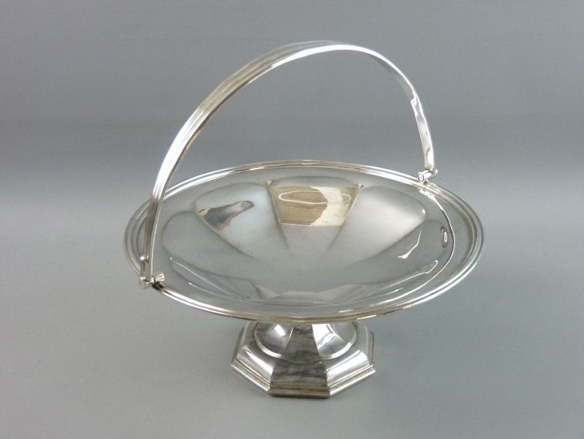 A CIRCULAR SILVER TAZZA on an octagonal pedestal base and having a triple lined border with swing handle, maker Walker & Hall, 26 ozs, Sheffield 1927