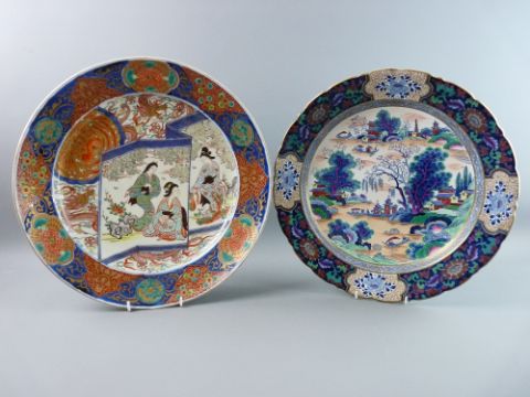A GOOD 19th CENTURY IMARI PALETTE WALL CHARGER, a cobalt and gilt rim with multi-shaped gilt decorated panels, the dish centre with folded panel of traditionally dressed women and surrounding red and gilt decorated five toed dragons and phoenix bird, the base leaf decorated with four rings, possible painter's mark and kiln stand remnants, 39.5 cms diameter along with a Booth silicone china wall charger, Ming pattern (cracked), 36.5 cms diameter