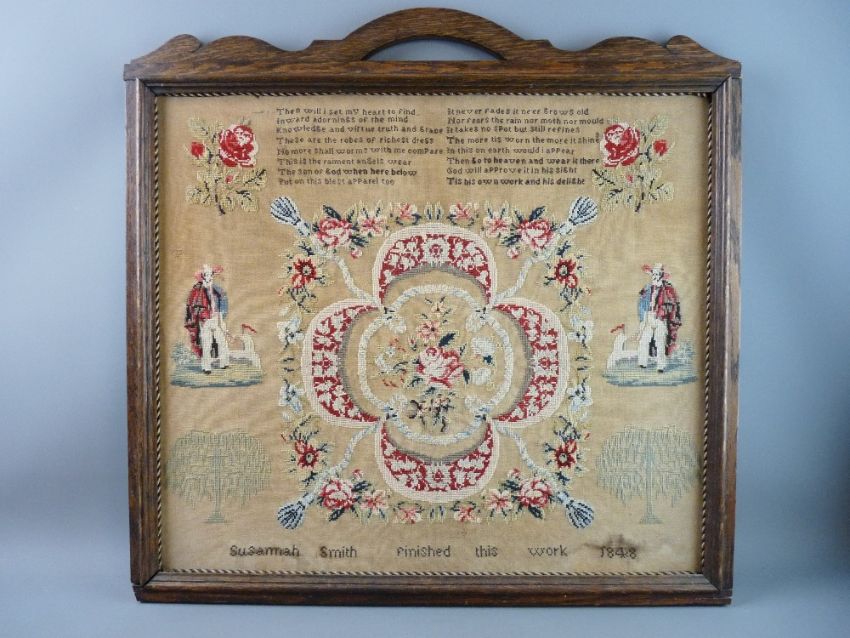 AN OAK FRAMED NEEDLEWORK SAMPLER having a floral and rope central panel, sixteen line verse above 'Then will I set my heart to find inward adornings of the mind', flanking decorations of roses, traditionally dressed gentlemen and willow trees with wording below 'Susannah Smith finished this work 1848', (one small area threadbare, some staining), 65 cms overall, 66 cms wide