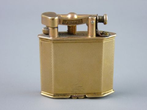 A NINE CARAT GOLD ENGINE TURNED DUNHILL CIGARETTE LIGHTER of oblong form with angled corners, 32 grms gross