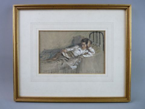 MARIA EATON mixed media - figure reclining on a bed reading, signed and dated 1910, 12 x 19 cms