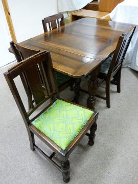 A 1930's POLISHED DRAW LEAF DINING TABLE with pineapple and block supports and four similar period polished splatback dining chairs