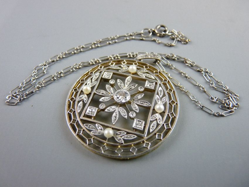 A DELICATE SILVER OBLONG LINK NECK CHAIN with a finely decorated circular gold backed pendant having tiny diamonds and seed pearls in a floral setting, with a centre diamond of a round cut solitaire estimated 0.3 carat, 10 grms gross