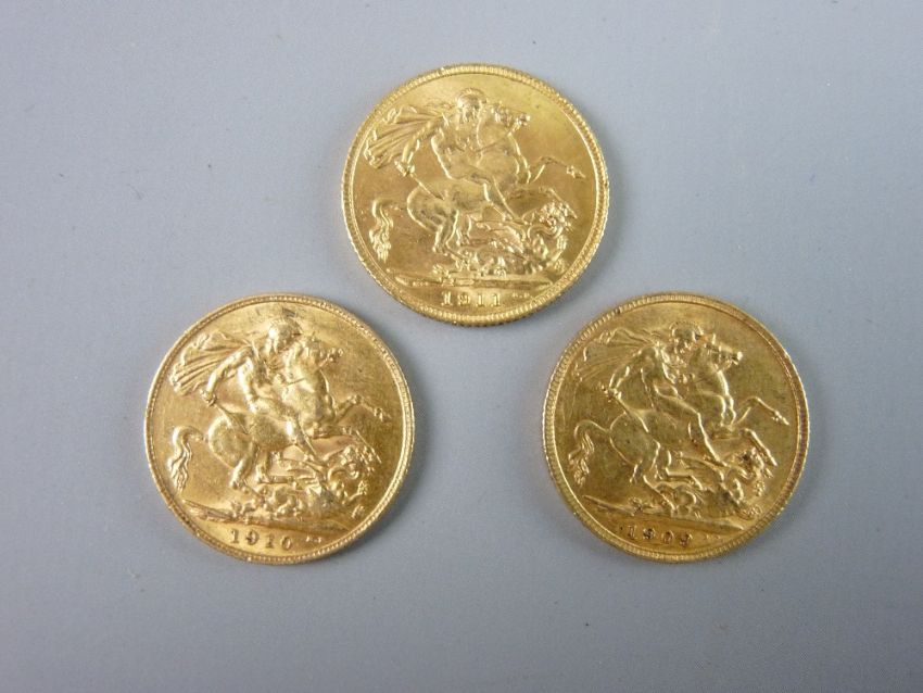 THREE GEORGE V & GEORGE VII GOLD SOVEREIGN COINS 1909, 1910 and 1911