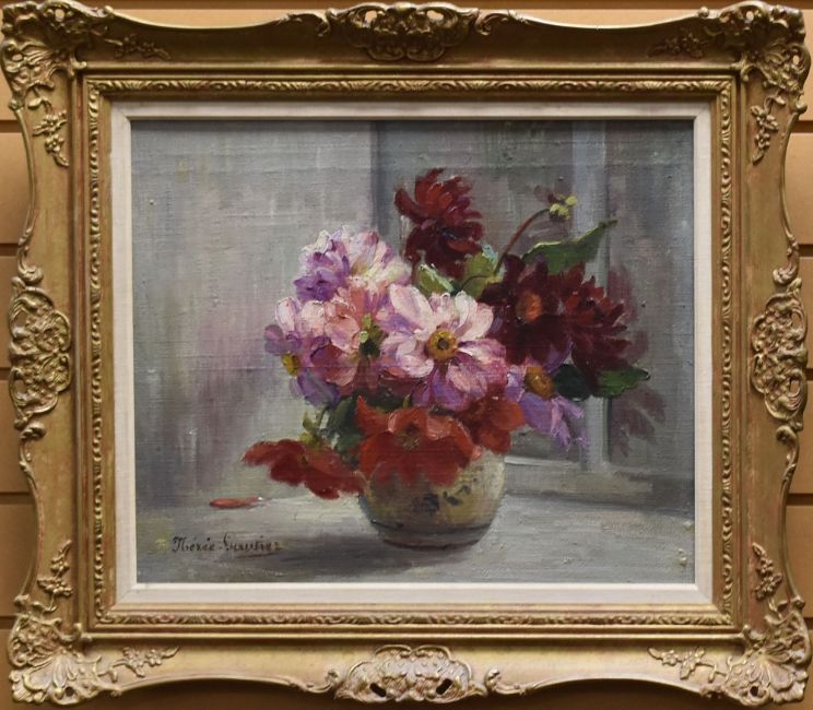 JANE NEREE-GAUTIER (French 1877 - 1948) oil on canvas- cut-flowers in a pottery vase on a window ledge, signed, 36 x 44cms